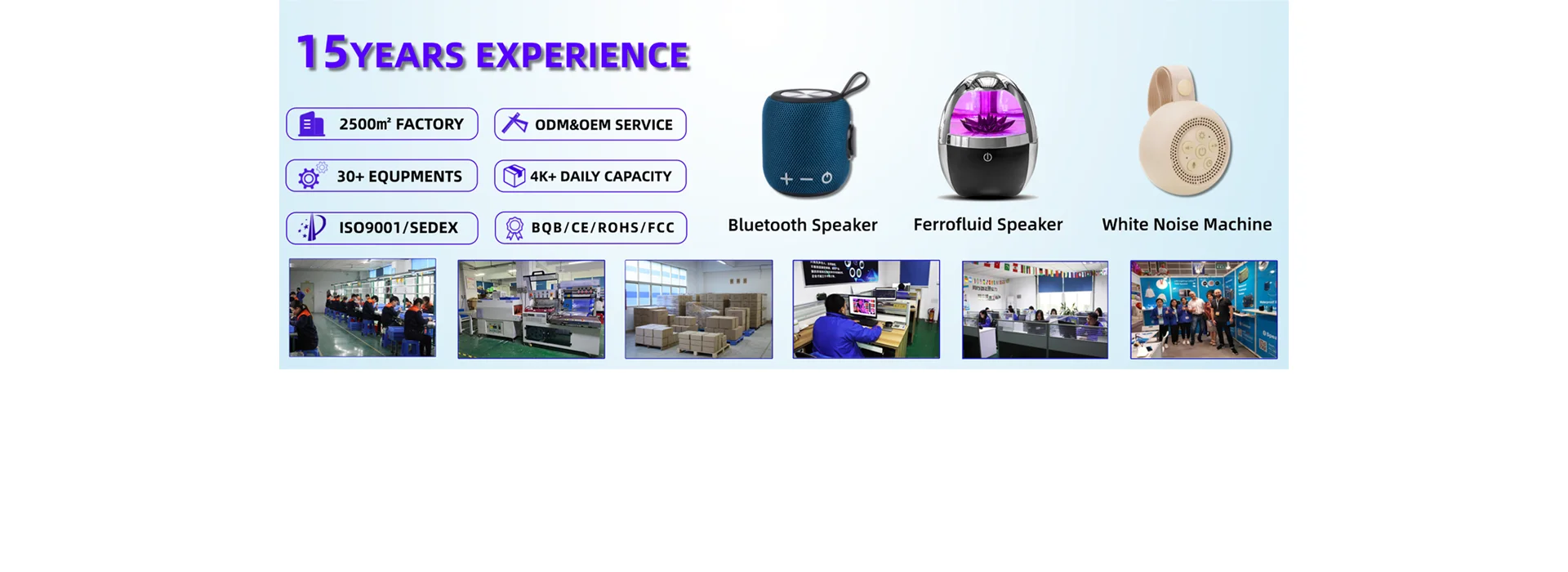 Founded in 2011,is a professional manufacturer of Wireless Speaker,White Noise Machine, Ferrofluid Speaker.We know well the great importance to the development of new products, sowe established our own R&D team, incl. electronic engineers and MD engineer, so as to provides customers with satisfactory OEM and ODM solution services. Our company always respect the original design, not only focusing on the appearance of the products, but also the practical design of products. Keeping closely with the latest trend of the market and demand,we are launching new products regularly every month.We had been selling products widely in domestic and foreign markets suchas the United States, UK, France, etc. So far we have cooperated with SNAP-ON, PSG, The Home Depot, KINGS and other international famousbrands for a long time.